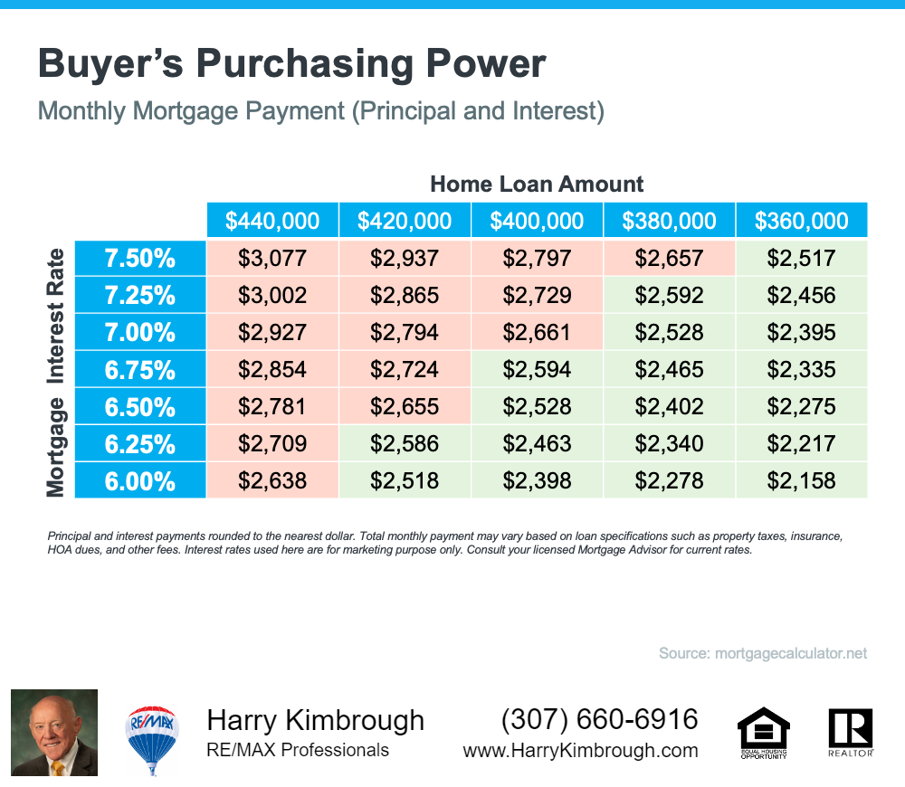 The National Association of Realtors (NAR) estimates that the median price of a home is $379,100. Let's say you want to purchase a $400,000 house. Here is how your purchasing power can alter as mortgage rates rise or fall if you're trying to shop at that price range while keeping your monthly payment at $2,500 to $2,600 or less (see chart below). Those that are beyond that level are shown in red, while payments that are within your intended range are shown in green.